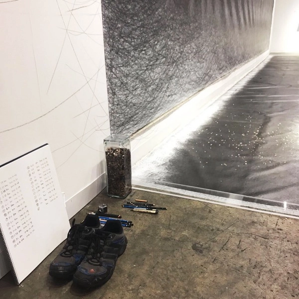 Between October 2016 and January 2017, the artist completed a total of 98 kilometers at the Kaohsiung Museum of Fine Arts, with the final 2 kilometers being completed at Art Basel in Hong Kong in March 2017. On view in this exhibition are the two canvases, a time-lapse video of his performance, related documents, and the pencil dust accumulated throughout the process. By taking the simplest of lines and the act of walking as its basic elements, A Walk of 100 Kilometers represents the manifestation of the artist's strong willpower and the long duration of his labor, imbuing both the work and the performance with an infectious power induced by the high level of intent concentration.
